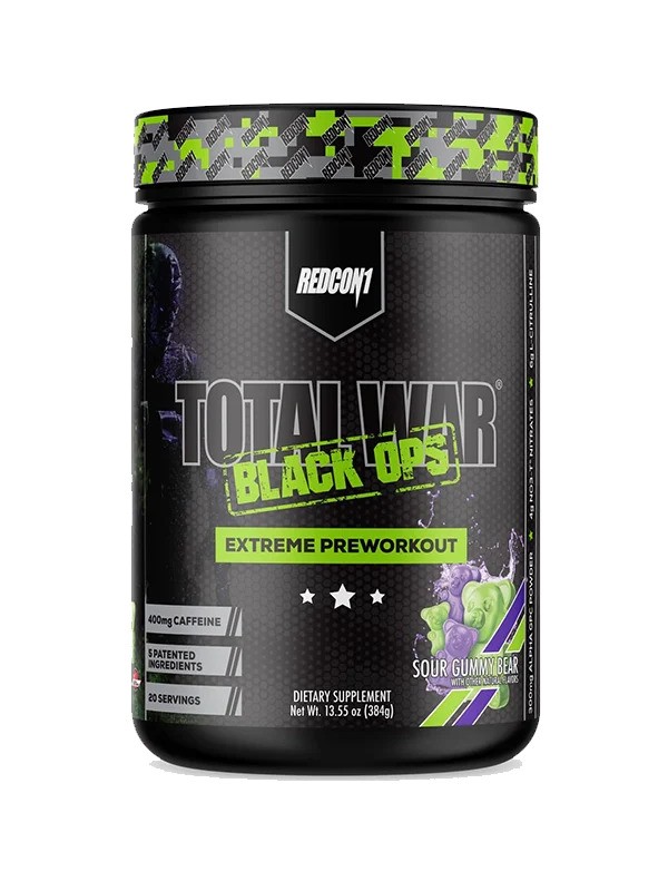 TOTAL WAR BLACK OPS is a fully dosed, high stimulant, powerful pre-workout with 10g of nitric oxide enhancing ingredients and a thermogenic complex. With 400mg of caffeine, advanced nootropics, and calorie-burning accelerants, TOTAL WAR BLACK OPS fosters mind and muscle connection with epic pumps.